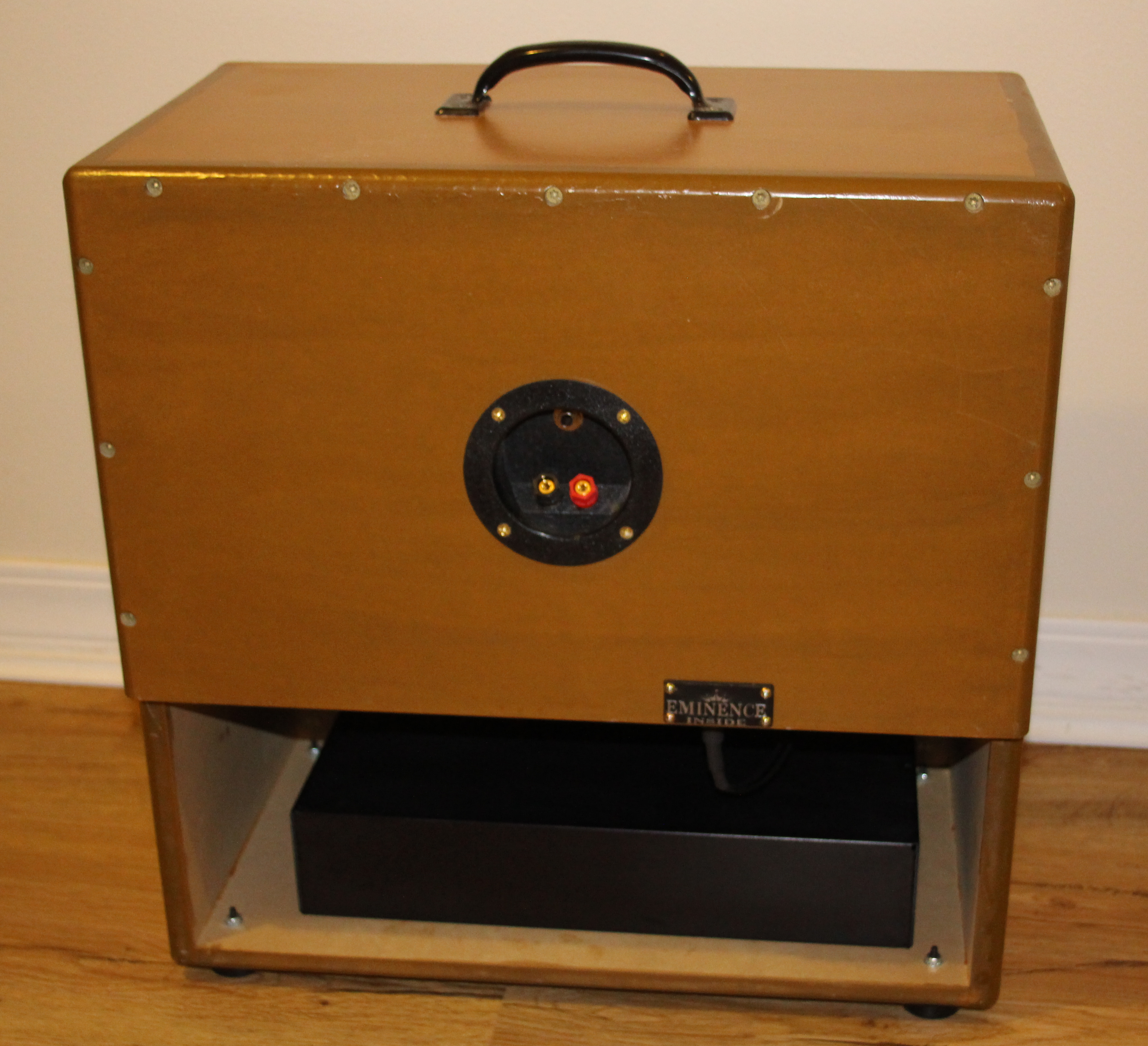 The cabinet was built by a local contractor out of MDF and is very heavy. An Eminence 820H speaker has been installed. the chassis is still in work. The tube lineup will be: 24A preamp, 27 second preamp interstage transformer driver, PP 45s output, and a 80 rectifier.