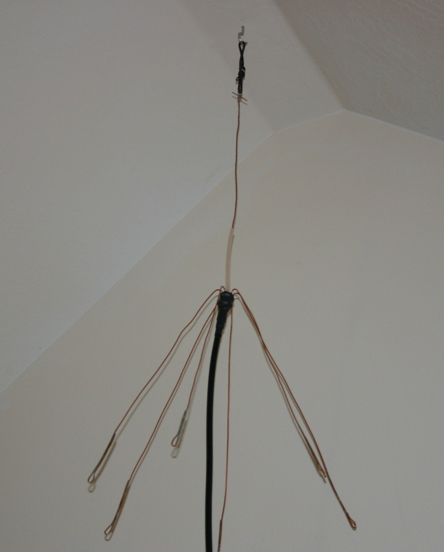 1/4 wave 2 meter antenna. I needed a 2 meter antenna for indoor use in my work room. First I tried a sleeve decoupled antenna made with a piece of RG213 with the center conductor as the driven element and a 1/2 copper pipe 19″ long over the outside of the co-ax with the shield soldered to it. I have seen this antenna recommend for use as an emergency or portable antenna usually with the shield pulled down over the outside of the co-ax to act as a decoupling sleeve. I could not get the VSWR very low and every time I moved or touched the co-ax the VSWR moved all over the place. Maybe a larger sleeve would work better. At this point I decided to build another antenna with drooping ground wires. I again used RG213. The shield was cut away leaving 19 in. of center conductor exposed. A loop was made at the end so a piece of cord could be passed through to hang it to a hook in the ceiling. About a 1/2 inch of shield was retained when it was stripped from the center conductor. Some heat shrink tube was placed over the co-ax just below the point where the remaining shield exited. The heat shrink tubing protected the co-ax from soldering heat and also provided a tight fit for a 1″ long piece of 1/2″ copper tubing which was slipped over the co-ax below the shield exit point. This piece of copper tube provided a solid point to which the shield and the ground plane wires could be soldered. 8 wires 19″ long and the co-ax shield were soldered to the copper tube. The ground plane wires were spaced evenly around the tube and covered with heat shrink to hide the ugly solder job. A small loop was made in the end of every ground wire so I would not get a poke in the eye when I got under the antenna to tune it. I did not tune the antenna in the usual manner of changing the driven element length for minimum VSWR. I used a MFJ-259 antenna analyzer to tune to resonance. The driven element came out to less than 18″ probably because I left about 6″ of insulation on the center conductor (driven element) and made the element look electrically longer. After much cutting the driven element came out too short so I added a short piece of #14 solid wire to the top to load it a bit. It resonated at 146.13 with no more changes The ground wires were shortened also providing a sharper resonance point. The ground plane wires were then bent away from the co-ax until the meter gave a minimum VSWR reading. Moving the co-ax or touching the outside does not change the VSWR so the ground plane must have gotten rid of all the RF on the shield. The VSWR at 146.13 is not measureable and the highest is at 144 and is below 1.2. I can now get into two repeaters. See the picture below.