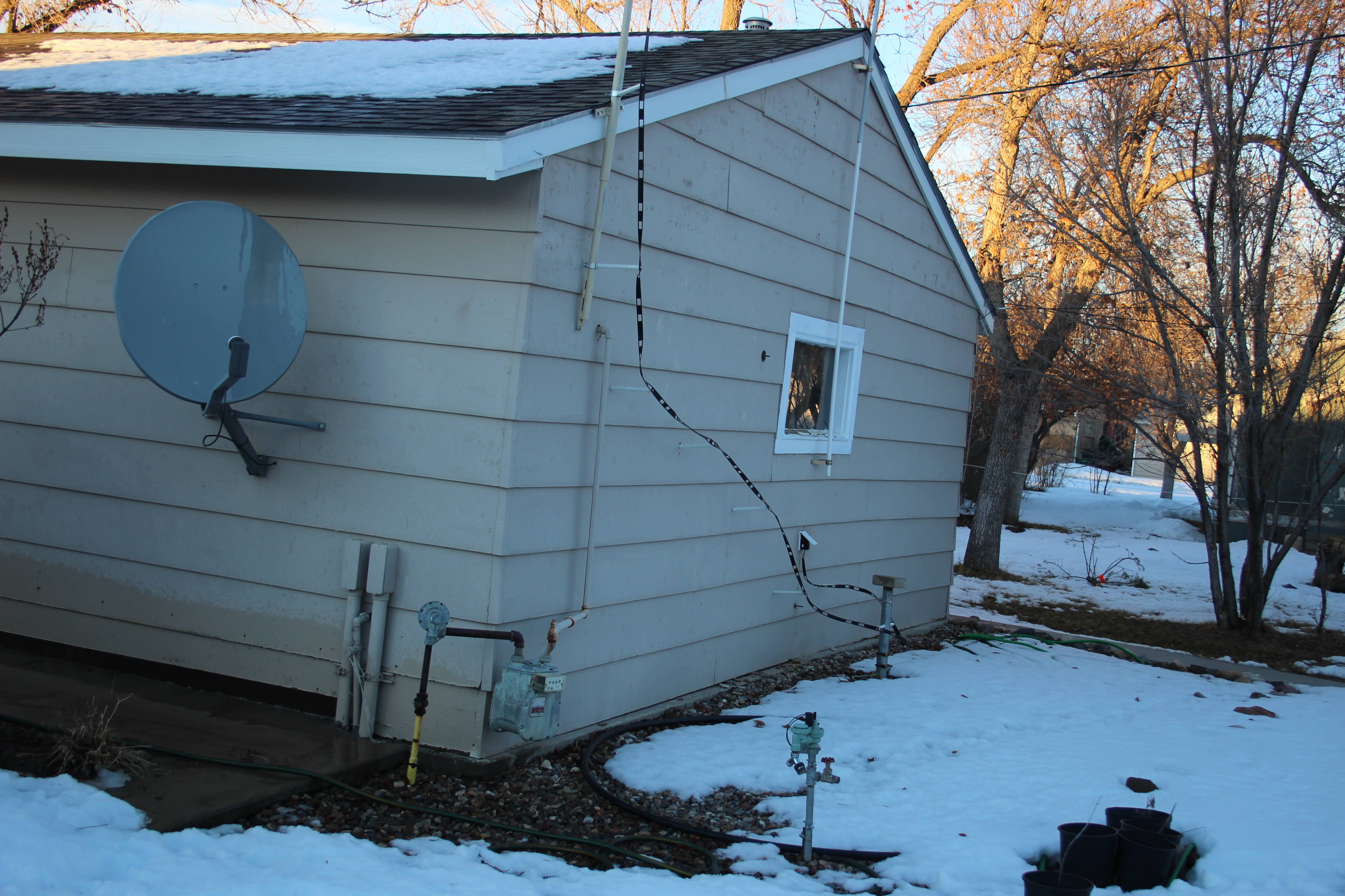 The antenna is made from copper weld wire with over 500 lb pull strength. A fiberglass ladder line dipole junction from MFJ supports the ladder line at the feed point. I did not know if the fiberglass junction block would hold together on an antenna of this size after being exposed sun light so I placed an electric fence compression insulator at the feed point and hung the MFJ block below it on wires from the insulator, the MFJ block now only supports the ladder line. The supports for the antenna are 10 foot long fiberglass poles. The fiberglass poles are 7/8th inch in diameter and are sold as tree stakes. The poles are flexible and are very good insulators. The fiberglass poles are inserted 2 feet into 8 foot long pipes 1 inch in diameter and locked in place with 1/2in bolts threaded through the side of the pipe. The 1in pipe is reinforced by 2 feet of 1.25in pipe where the support pipes attach to the roof eaves or attach to posts in the garden. Each half of the dipole is supported at its mid point by a fiberglass pole. The East end by a garden fence pole and the West end by a TV antenna tripod in the center of the roof on the old garage. The feed point of the antenna is brought into the garage by 50 feet of ladder line. The ladder line is spaced away from the support pole and supported by 8 inch spacers made from ¾ inch fiberglass tree stakes. The ladder line snakes around an unused well casing which will someday have a lightning arrester and then through a 50amp plug and into an outdoor weather proof socket. This probably not the best RF practice, but permits unplugging the antenna when a storm is due. More ladder line inside the garage carries the signal from the weather proof socket to a 4:1 Palomar BA-4 balun. The balun connects to a MFJ 927 auto tuner and then through 185 feet of LMR400 coax run through underground conduit into the house and up to my work room/shack. At one time I thought I might run a vertical against an earth ground with a 10 foot run to a ground. Because this would be an imperfect ground, I added two sets of Palomar sleeve ferrites to the LMR400 at the garage end to keep RF local. This essentially gives me a 1:1 balun into the auto tuner and 4:1 balun out of the tuner. It does not seem to bother anything. I measured the loss of the 185 feet of LMR400 to be 1db at 30Mc and 2db at 60Mc. The electrical ¼ wavelength of the LMR400 run seems to be around 1Mc, I shorted the garage end and looked at it with an antenna analyzer. The analyzer showed alternate dead shorts and 500 ohms at 1Mc intervals. The analyzer only goes down to 1.8Mc so I do not know what the actual electrical ¼ wavelength is. I am too lazy to build a bridge and check it with a function generator. There was no need to do this check on the feed line, I did this check just to see what I could see and because I could. I got lucky, with all of the mismatches and long feed lines I get a good match on 10 meters without a tuner. The match looks fair on 6 meters, but the band is dead so I don’t know if it works up there or not. Come June or July I should know. I have not yet added the relay and antenna amplifier to bring LW and AM broadcast into the house on a run of RG-6.