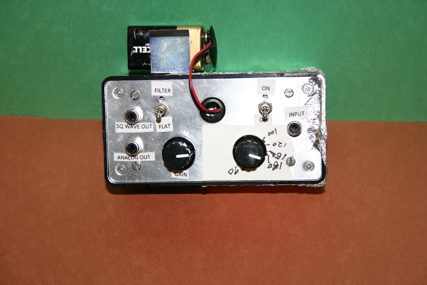 NEW: I received an Email from Gary Jarrad of Adelaide, South Australia suggesting an interesting experiment. He suggested taking the sensor out on a cloudy night and looking at reflections from the clouds. I took the sensor, filter box, and the boom box out in the garage on a rainy night. I set the sensor up just inside the garage and aimed it outside through the door at a heavy cloud cover. The system was first tested by aiming sensor at a distant streetlight that I could see. When the streetlight was focused on the photo cell, the boom box let out a loud roar letting me know every thing was still working. When looking at the cloud cover with the filter box in the “flat” mode (no filter) I just heard white noise. When the box was switched to “filter” I could hear a distinct hum when peaked up at 120cps, I was surprised to hear another but weaker peak at 180cps the third harmonic. This is a small town and all the streetlights are within two miles of each other, also they are all of the same type so I would expect the bright and dim cycles of all be in phase. At least my original idea worked sort of. Thank you Gary