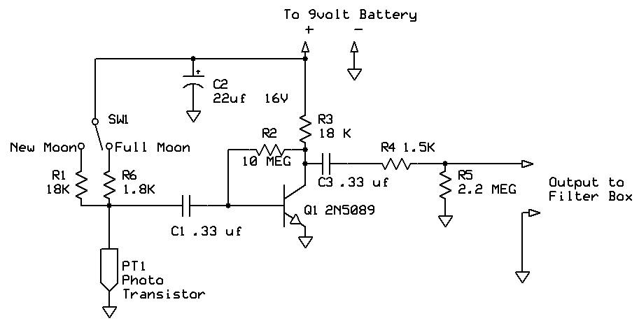 A SPDT switch was added to the photo transistor board to select bias/load resistors for the photo transistor. See the schematic for the modified photo detector board. R1 18k for low light inputs such as a new moon and R6 a 1.8K for high light conditions such as a full moon. With the switch in the 1.8K position the sensor board is not saturated when pointing it outside during a sun lit day as previously noted. The sensitivity is greater with the switch in the 18K position. While the photo transistor board was apart for modifications, The input impedance to the 2N5089 amplifier was measured. The input impedance was 34K, pretty high for a common emitter amp. Oh the wonders of very high beta transistors and their high value bias resistors.
