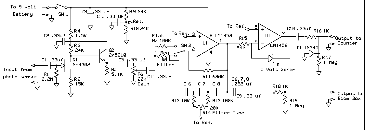 The pre-amp input section provides a high input impedance so as to not load the sensor output. It has an input impedance of greater than 2Meg. The output impedance is low in order to drive R6 the 20K gain pot. The voltage gain of the Q1 Q2 preamp is only 1.1 and serves mainly as an impedance matching stage. The input FET Q1 a 2N4302 is configured as a common source stage followed by an emitter follower stage a 2N5210. C11 isolates the inputs from ground reference to the filter opamp and permits the feedback resistor R11 to set the DC operating point of the summing junction pin 2. The opamps are a dual unit a 1458. The first section acts as an amplifier or as narrow band pass filter. With the switch in the flat position all frequencies from 30Hz to27Khz are passed from input to output with a gain of 7.5 .Both op amps are referenced to 1/2 the power supply battery or 4.5volts by resistors R9 and R10. the opamps think 4.5volts is ground and that they are operating with + and- 4.5volts. The second opamp operates as a limiter to produce a square wave output to drive a counter. The limiter has no feedback resistor so the gain is the open loop gain of the amplifier. A 5volt zener diode in the feedback loop lowers the gain to almost zero when the diode conducts .6volts forward and 4 volts when zenering.(a 5 volt zener has a very sloppy knee at low currents and starts to conduct at 4volts). C10, R17, and a Ge diode in the output of the limiter give an output that looks like the output of a TTL logic gate and is a suitable input for my frequency counter. The output is not the best square wave I have seen because the 1458 opamp has a slew rate of only .5volts/micro sec. With the input switched to the first opamp in the filter position, a Hall network is switched into the feedback loop turning the amplifier into a narrow band tunable filter. Capacitors C6,C7,C8,Resistors R11, R12,R13,and R14 make up the Hall network. With the switch in the flat position R11 remains in the feedback position.