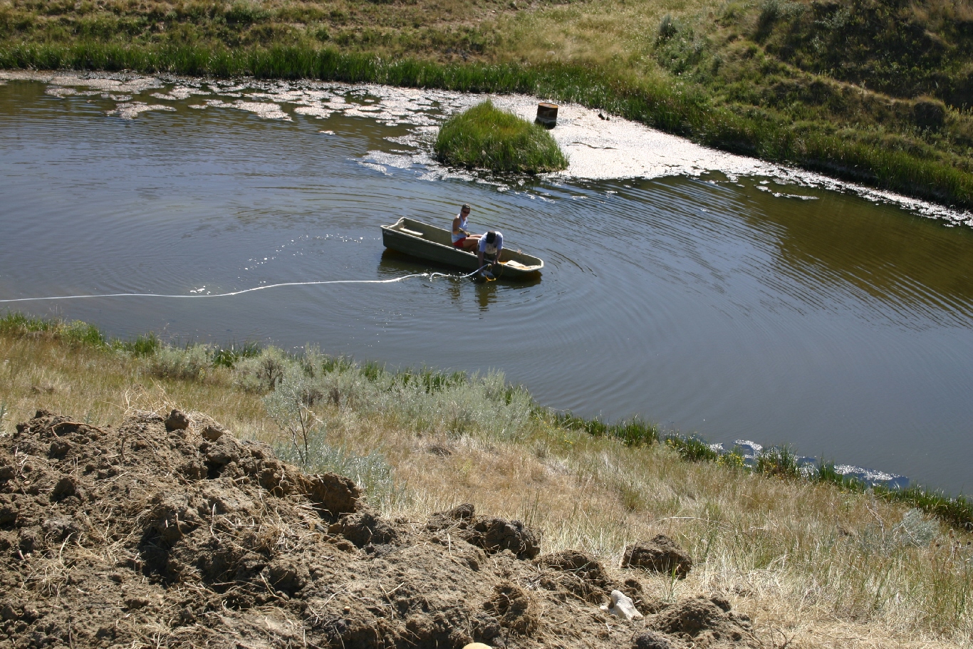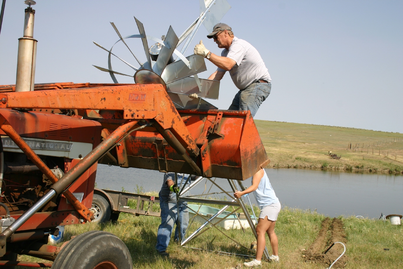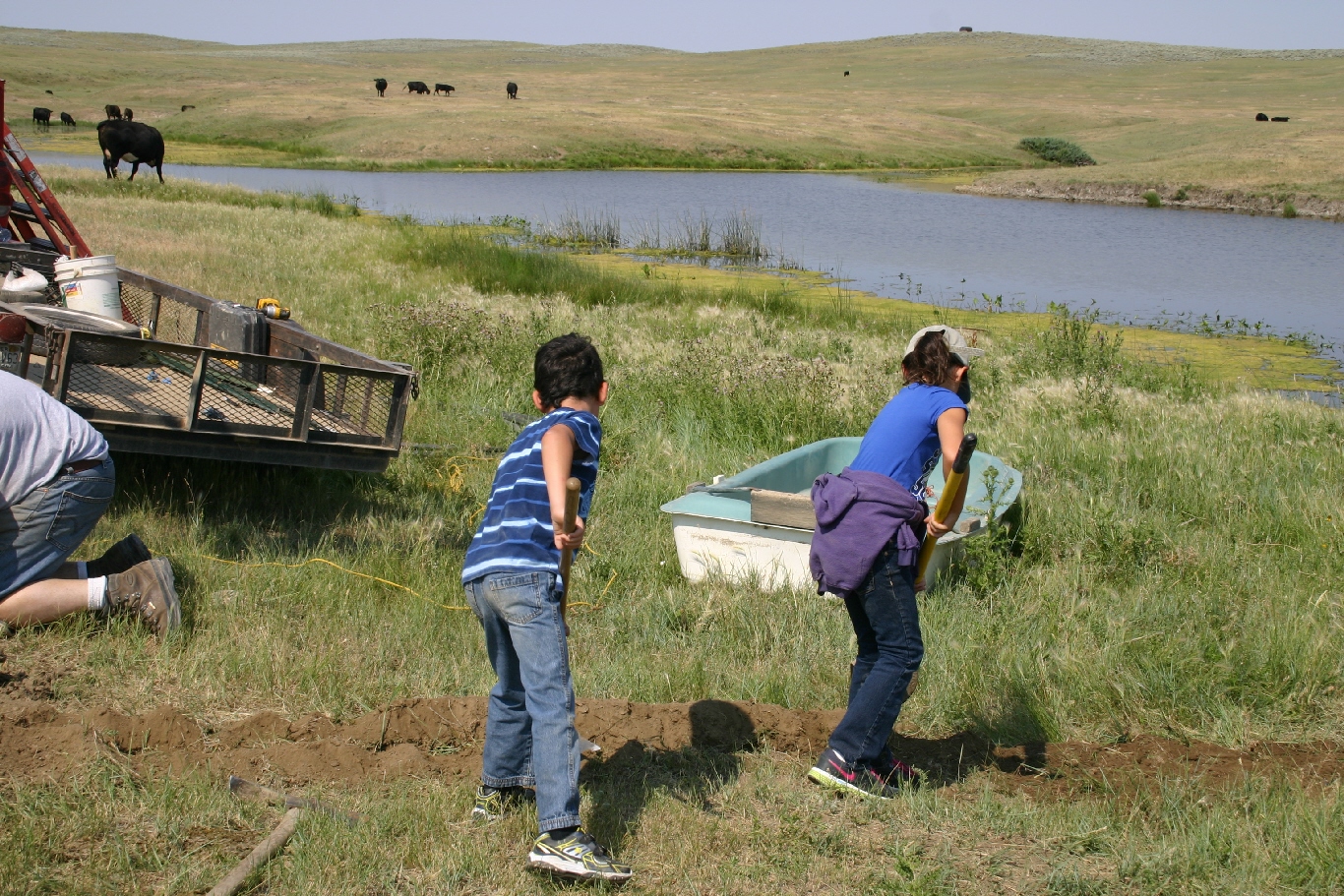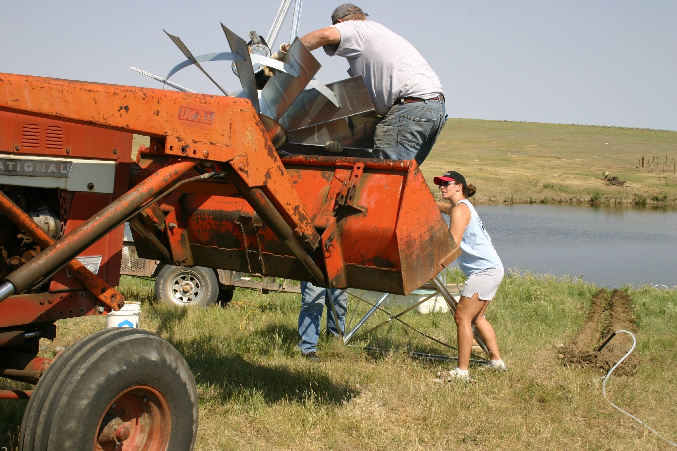 The first windmill on the big reservoir worked so well cleaning the water, we decided to order another one for a smaller reservoir where Rusty’s cattle drink. July 27th 2013, Ted Kronebusch and Wally McHenry brought the new windmill out to the ranch and with the help of Rusty, Rachel (our water rights lawyer), and Brigette Clark plus our Grand children set up the new windmill. All of Rusty’s cattle came down to watch windmill being set up. Our Grand children Emily and Jacob were staying with us for 10 days and had a great time watching the windmill setup. The Grand kids helped by throwing rocks at Ted while he was in his boat placing the air line. Ted got even by throwing a shovel full of water on the kids.