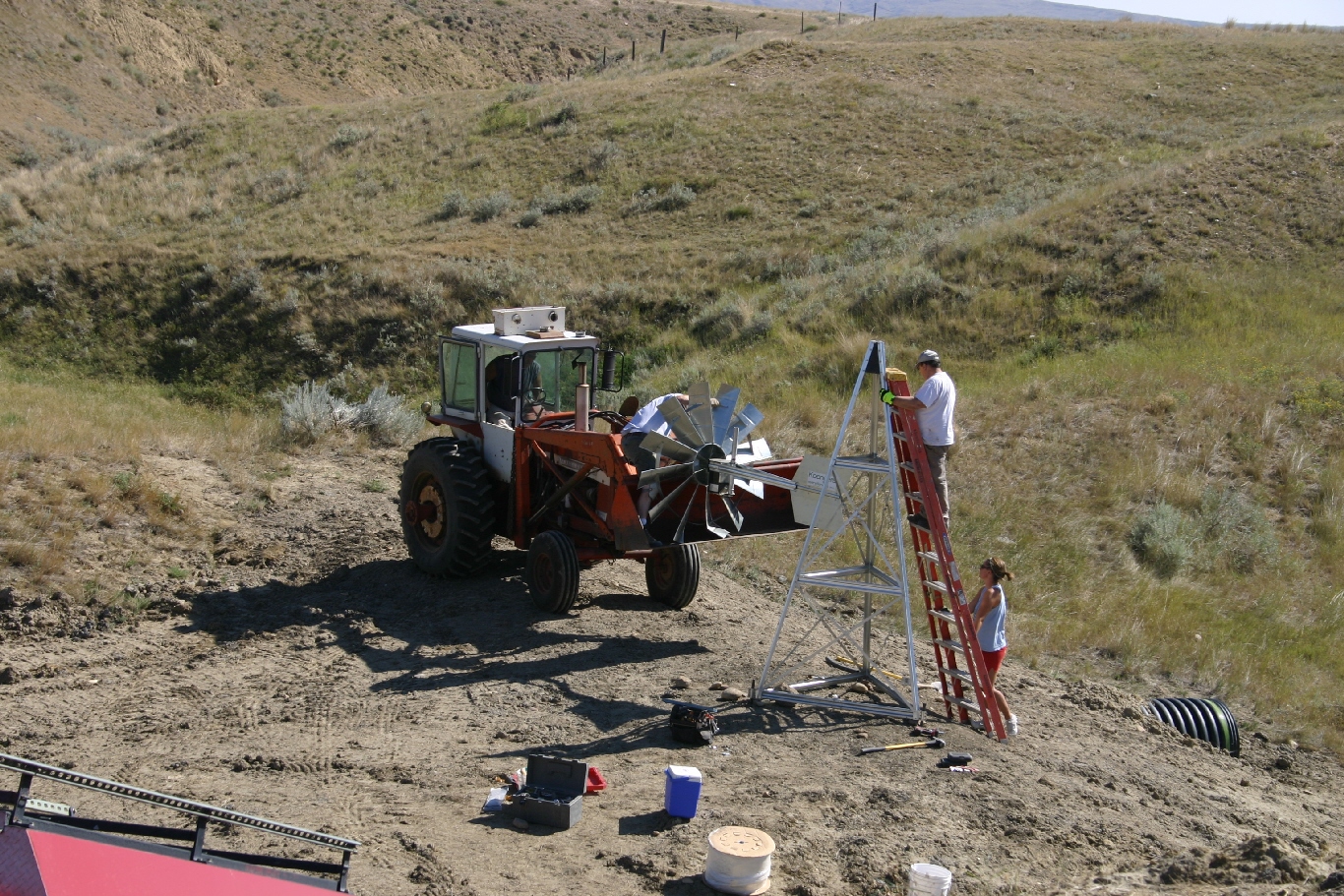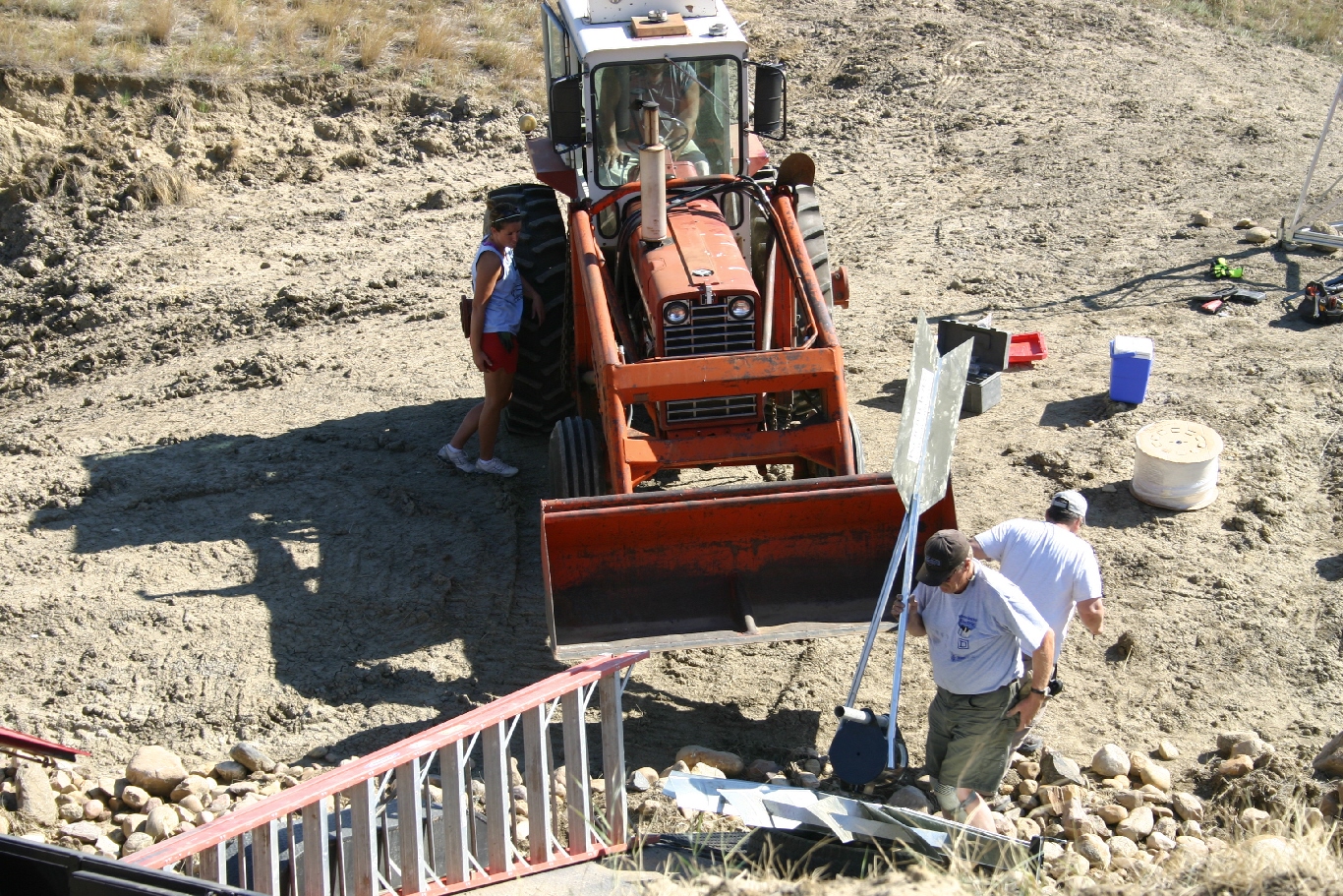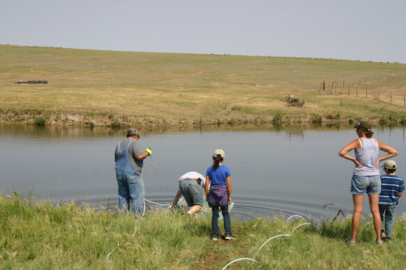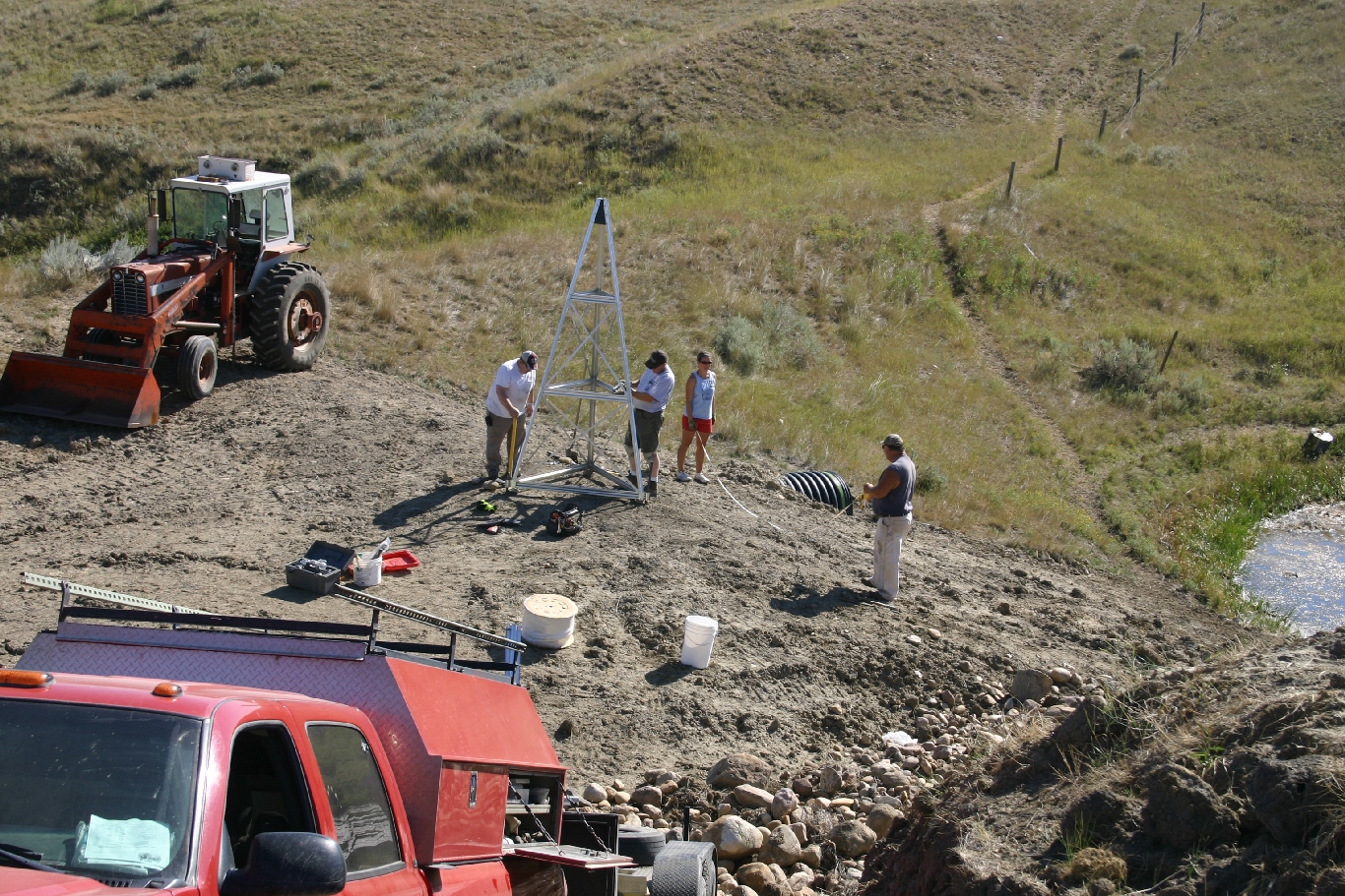 The first windmill on the big reservoir worked so well cleaning the water, we decided to order another one for a smaller reservoir where Rusty’s cattle drink. July 27th 2013, Ted Kronebusch and Wally McHenry brought the new windmill out to the ranch and with the help of Rusty, Rachel (our water rights lawyer), and Brigette Clark plus our Grand children set up the new windmill. All of Rusty’s cattle came down to watch windmill being set up. Our Grand children Emily and Jacob were staying with us for 10 days and had a great time watching the windmill setup. The Grand kids helped by throwing rocks at Ted while he was in his boat placing the air line. Ted got even by throwing a shovel full of water on the kids.