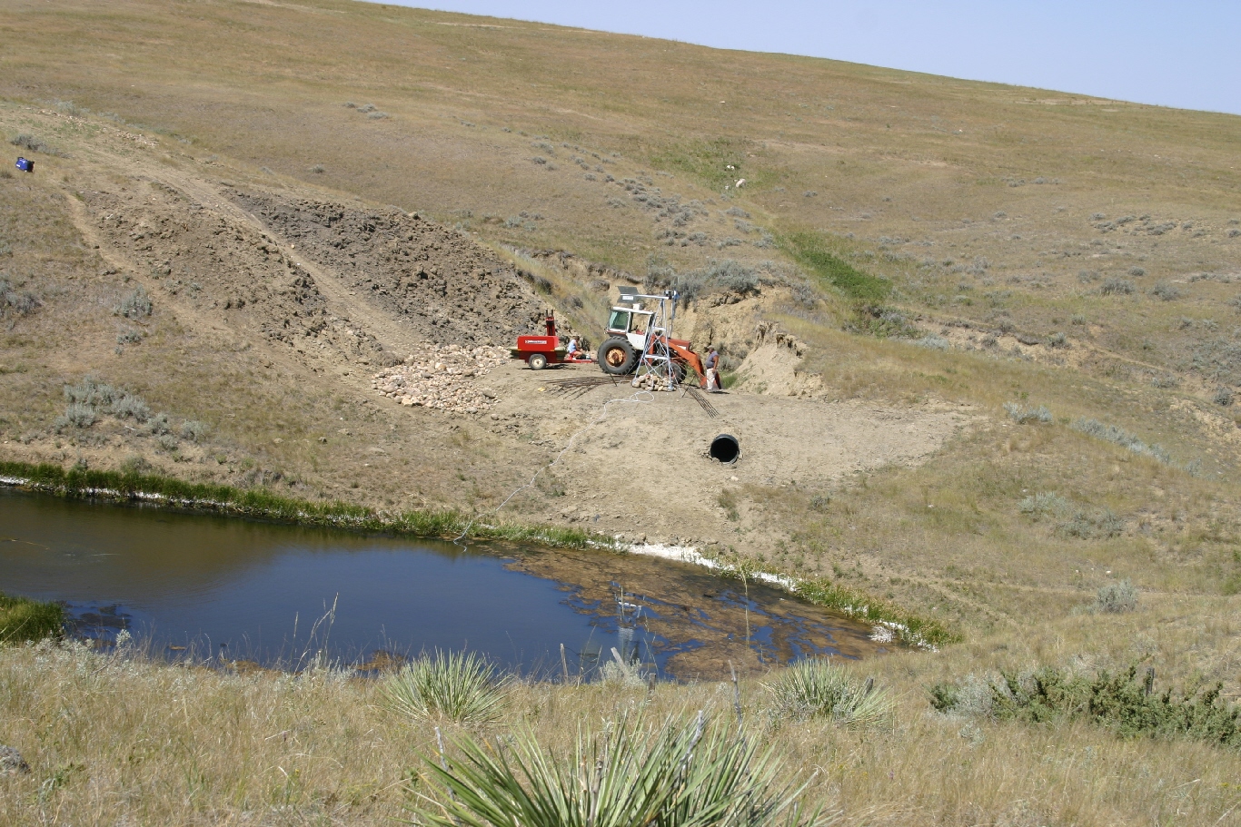 In June of 2012 We had Jim Ayers and crew rebuild the spillway on the big reservoir, a picture of the reservoir appears in the pictures above. A picture of the rebuilt spillway appears below. On 8-18-2012, Ted Kronebusch and Wally McHenry of Kronebusch Electric with help from Rachel Clark and Rusty Clark installed an air pumping Koenders windmill to pump air into the reservoir to improve the water quality and break up the thermal cline.