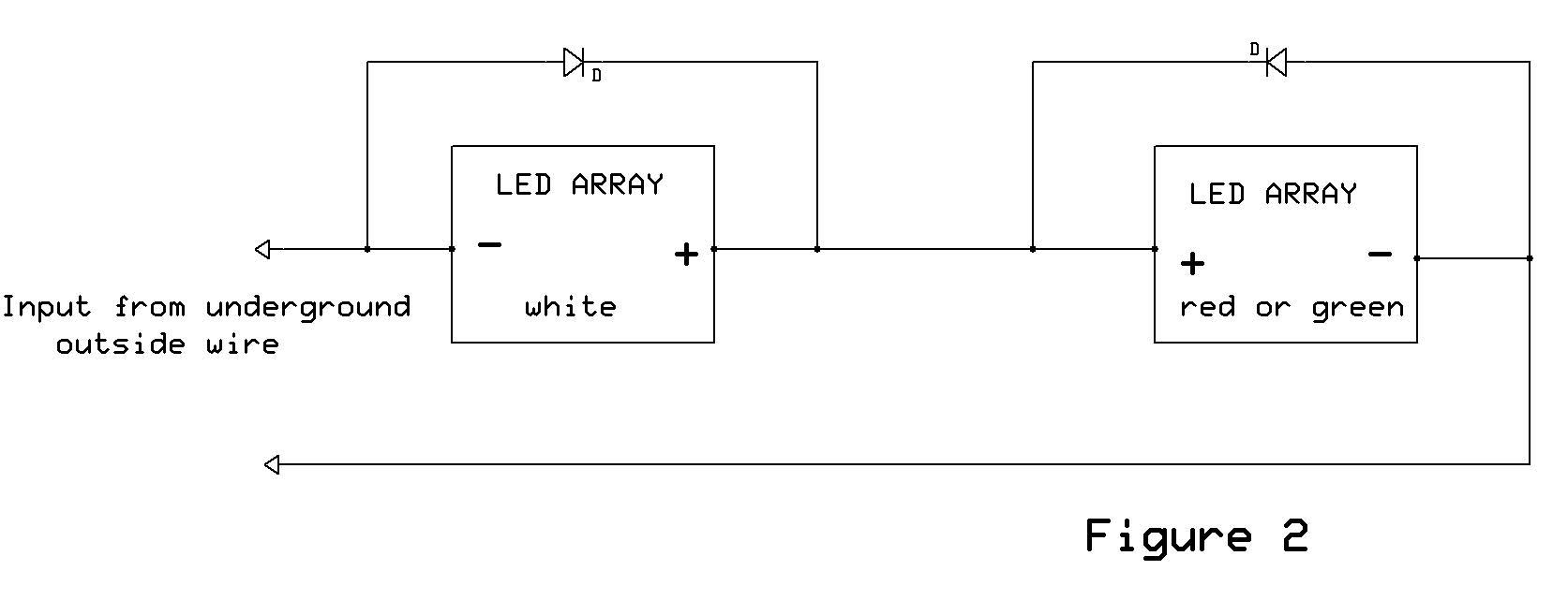 Several years ago, I got tired of frequently replacing the halogen incandescent bulbs in our landscaping lights. The incandescent bulbs were replaced with LED arrays that were to be used to replace the dome light blubs in cars. Even if you never buy from Amazon it is a good reference to see what is available in the way of LED dome lights. Many colors including white are available. Figure 1 shows what is in the garage, a bridge rectifier and toggle switch were added to the original transformer/timer. This arrangement powers the out door lights with unfiltered DC and the ability to reverse the polarity of the DC going to the lights. By changing polarity, different color lights are activated in the outdoor lights. We display white lights most of the year and red and green during the holidays. Figure 2 shows what has replaced the incandescent bulbs. The usual way to indicate polarity using two LEDS is to wire them anti-parallel so that one lights for a certain polarity and the other lights when the polarity is reveresed. This would probably work with these LED arrays but this would reverse bias the off array by over 12 volts. There are no specifications available on what the max inverse voltage these LED arrays will tolerate so they were wired as shown in Figure 2. This arrangement limits the inverse voltage across the off array to less than one volt. Extra “goodies” have been added to these LED arrays over the years, some have a built in bridge so they are not polarity sensitive, some have a built in resistor so they look like an incandescent bulb to the car canbus error detect system. These will work just fine as landscape lights. Some newer ones have a built in IC that provides a constant current to the array I have never tried these and I don’t know how they would react to the unfiltered DC. Use the simplest array available, they cost less and work just fine.